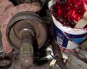 | The drive axles and constant velocity joints appear to be in very good shape. The grease in the constant velocity joints was so old it looked more like 90 weight gear oil. The joints will be repacked with Mobil 1 synthetic grease and new "Super Boots" installed. | ![]() |