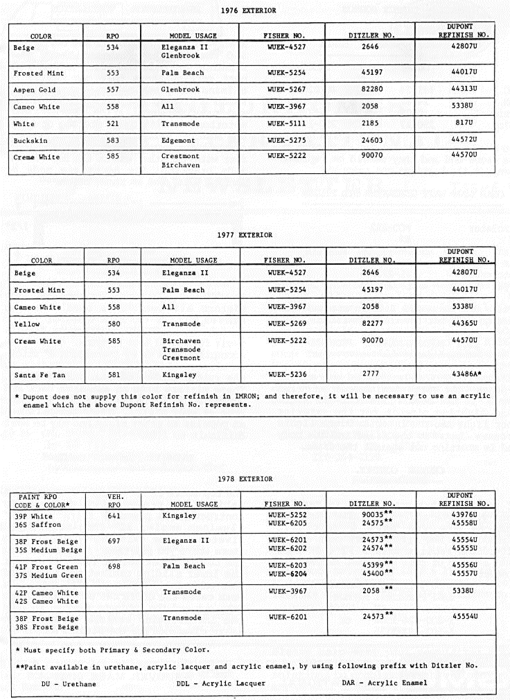 Exterior Paint Codes 1976 Through 1978