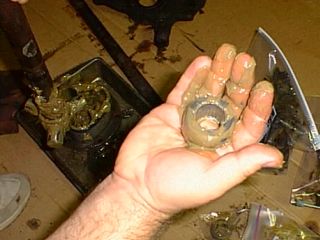 ![]() | After removing the old boot, you must probe around in the grease to find the open side of the retaining clip. Once you've found the open side of the clip, have your helper pull up on the shaft while you spread the clip and the shaft should pull out of the joint easily. In this picture, the clip is still in place after the shaft has been removed and the open side is at the six o'clock position. |