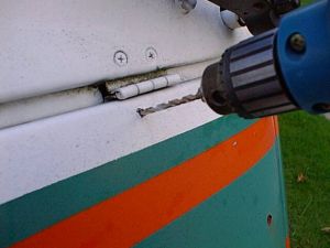 | The twentyfive year old fasteners on my coach were hopeless. After an hour of penetrating oil(along with generous four-letter lubrication), I decided a No. 21 cobalt drill bit was the solution. The phillips head makes drilling these a snap. | ![]() |