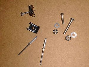 ![]() | Here's a look at the fasteners provided versus the stainless steel hardware I picked up at the local hardware store. I used No. 8 stainless screws instead of the "pop" rivets for the bottom bracket. All the other screws are No. 10 oval head stainless steel machine screws. All nuts were nylon locknuts. |