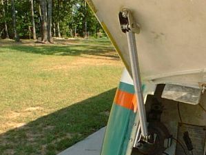 ![]() | Here's the finished product. I placed the top hole on the bottom bracket 4½ inches below the top of the opening, which is a little higher than called for in the instructions. This position was arrived at by trial and error. I first bolted the support to the cover and moved the aluminum angle up the fiberglass lip until the cover position looked right. I then clamped the angle in place temporarily to check the support's operation. Only then did I mark and drill the holes. One neat feature of this design is that the spring acts like a shock absorber when you close the cover, preventing the cover from slamming shut. Just pull on the spring and the cover closes. |